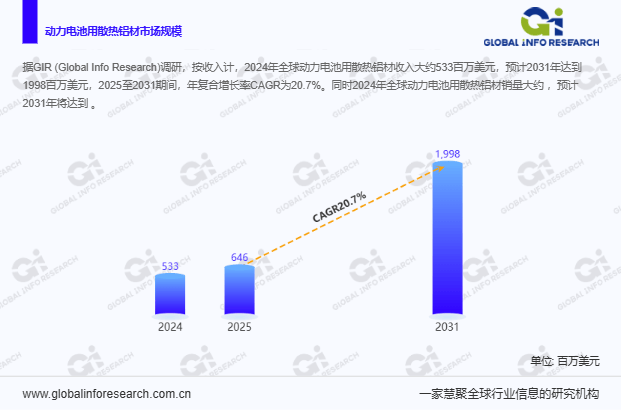 全球动力电池用散热铝材市场正迎来爆发式增长。根据Global Info Research(GIR)调研数据,2024年全球市场收入约为533百万美元,预计到2031年将飙升至1998百万美元,2025至2031年期间年复合增长率(CAGR)高达20.7%。这一增速远超有色金属行业中等水准,背后是多重因素的叠加驱动。